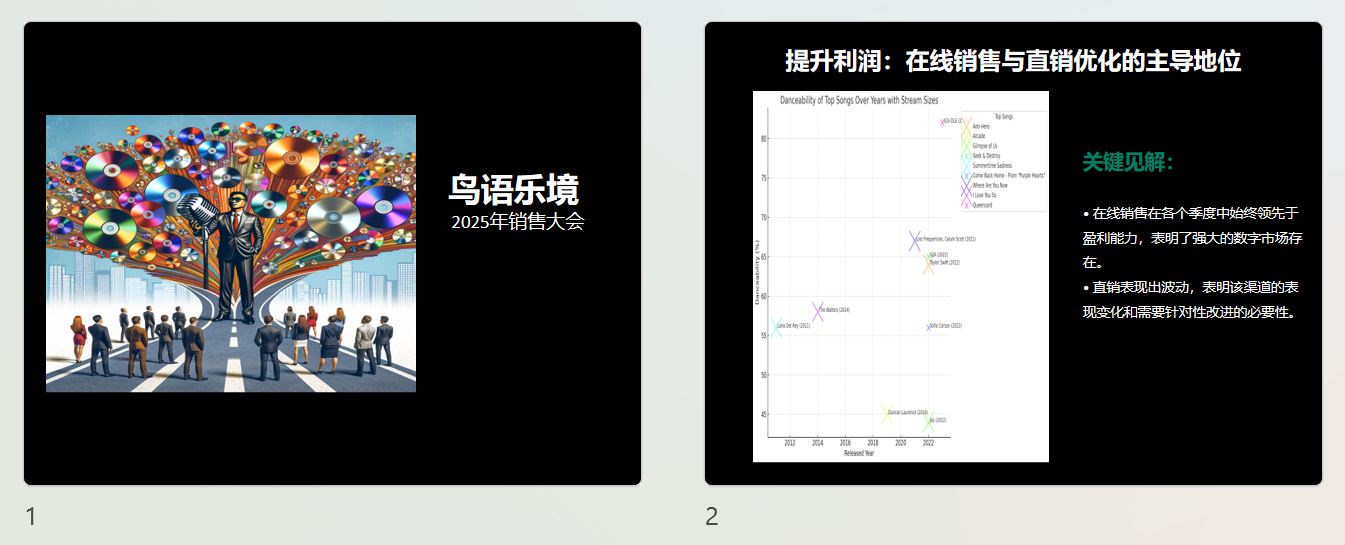 今天,我们要探索如何利用OpenAI的大语言模型完成一个有趣的商业案例:分析畅销歌曲数据,生成行业报告并创建PPT。我们将经历从原始数据到精美PPT的全过程,体验大语言模型的强大能力。