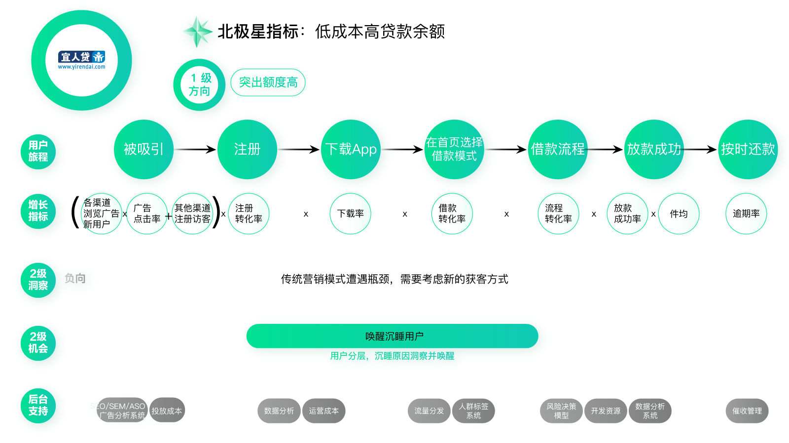我们找了不同职能的同事去了解增长机会点,最终从一位数据科学家口中得知(专家视角),在这上亿的注册用户里,真正在我们这里借款的只占很少一部分,大部分用户注册后并没有产生后续行为,成为了我们的沉睡用户。如果我们能适当唤醒这部分用户,哪怕只是很小的一部分,都可以用更小的成本带来更多的实际借款用户。