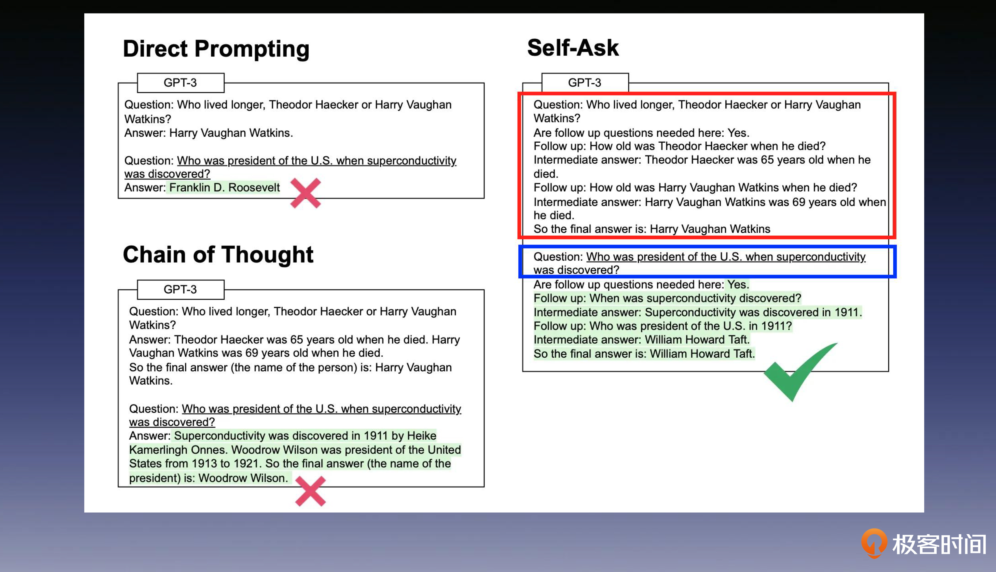 我们可以看到,在左边的图中,我们直接给大语言模型提出问题或者使用思维链的方式提示它回答问题,但都没有给出正确的答案。然而右侧的Self-Ask方法却给出了正确的结果,为什么会这样呢?下面我为你详细解释一下, Self-Ask 在这个过程中做了什么。