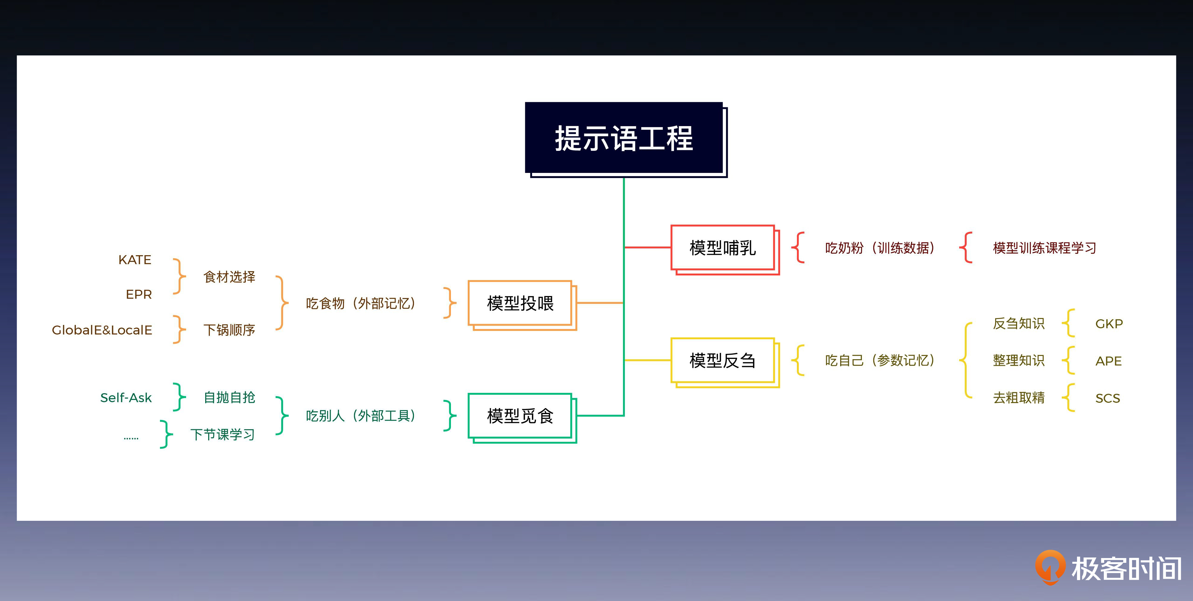 之后我们还进一步学习了怎么让大模型学会打猎觅食,自主地使用外部记忆和工具,解决它所遇到的各种现实问题。你可以参考后面这张图回顾今天的重点内容。
