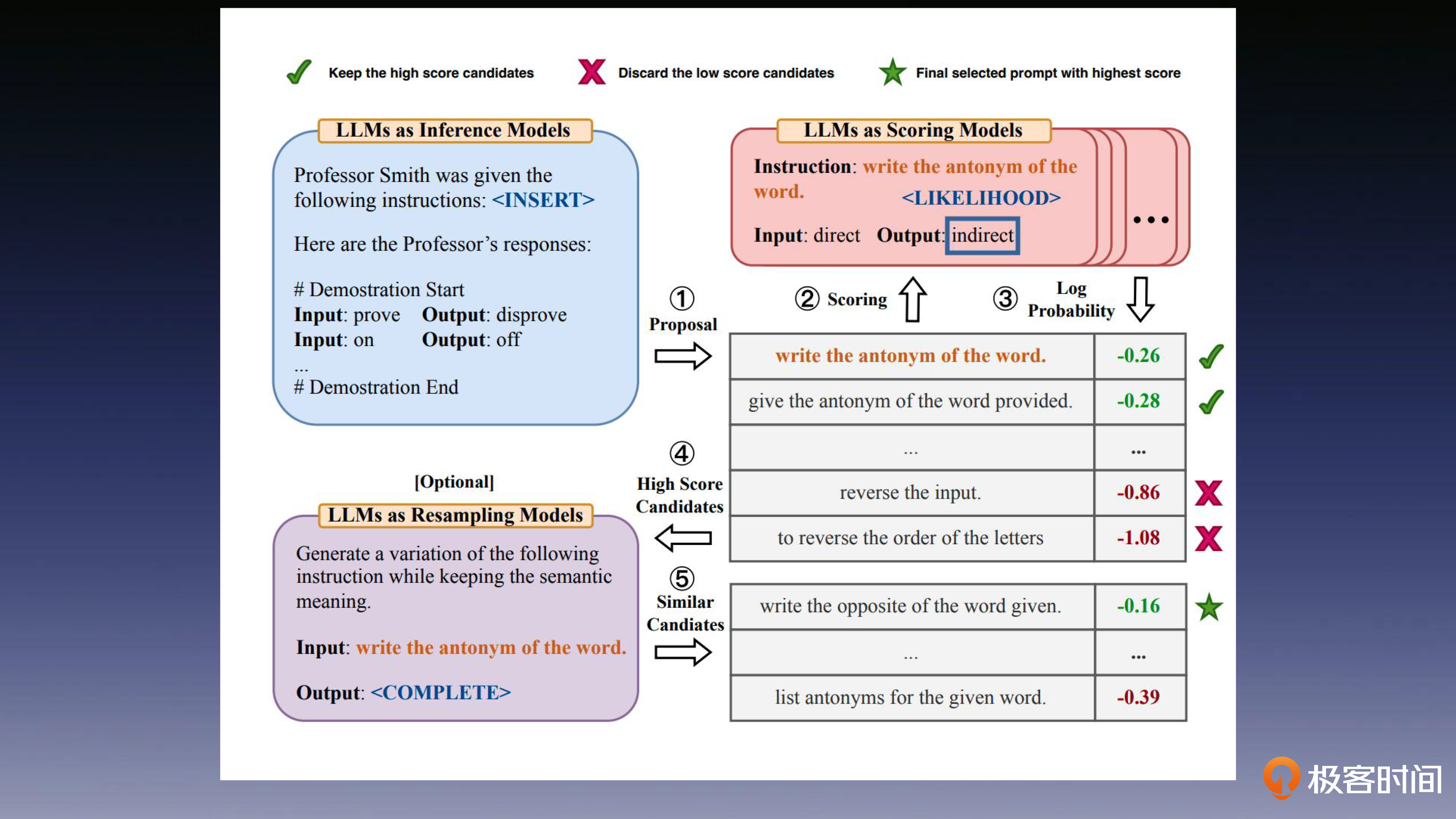 之后,你需要使用大语言模型作为打分模型,给每个提示语模板打分,选出分数最高的提示语模板作为这个任务的模板。