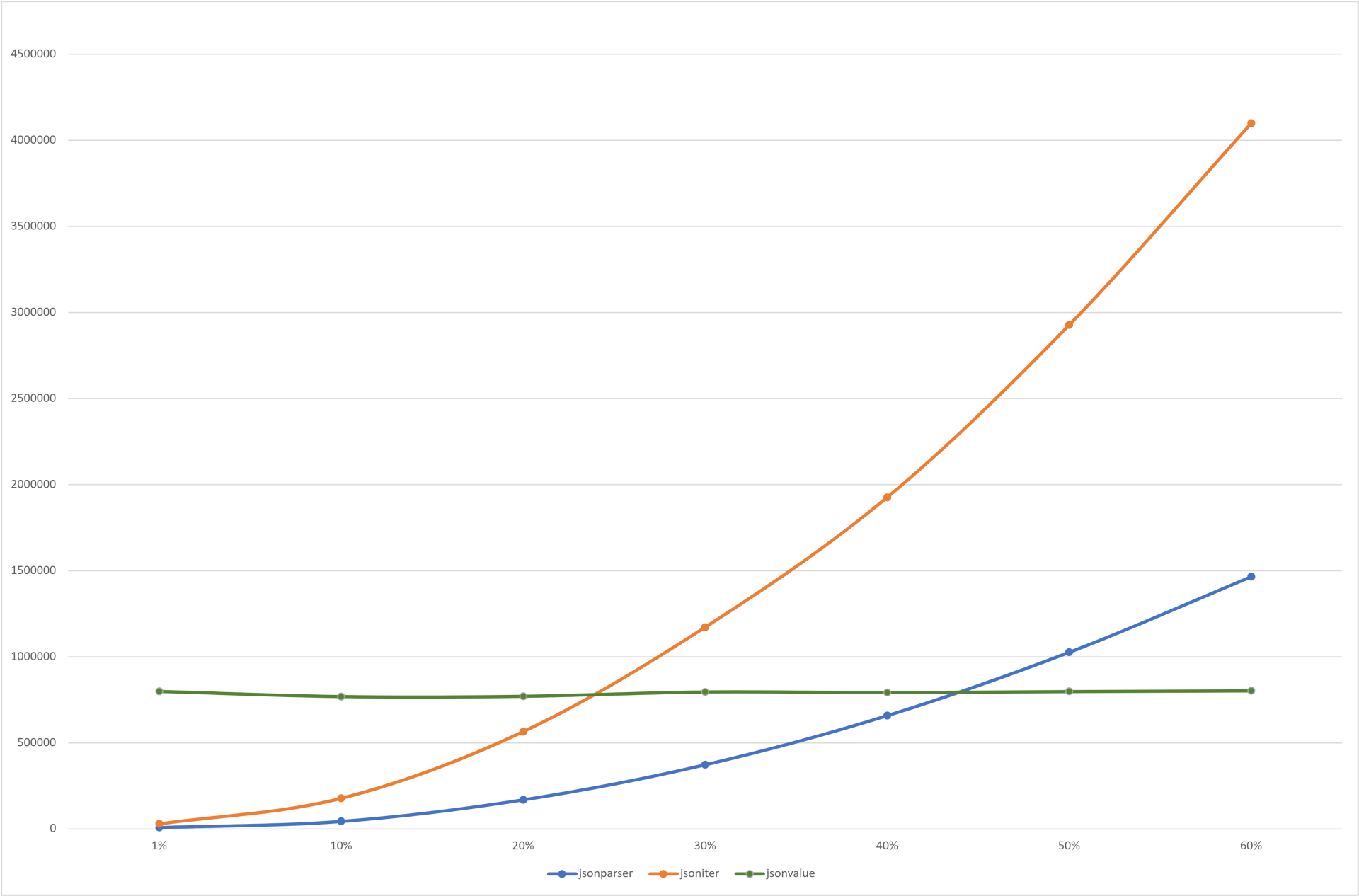 可以看到,当 jsoniter 的数据利用率达到 25% 时,和 jsonvalue、jsonparser 相比就已经没有任何优势;至于 jsonvalue,由于对数据做了一次性的全解析,因此解析后的数据存取耗时极少,因此在不同数据覆盖率下的耗时都很稳定。