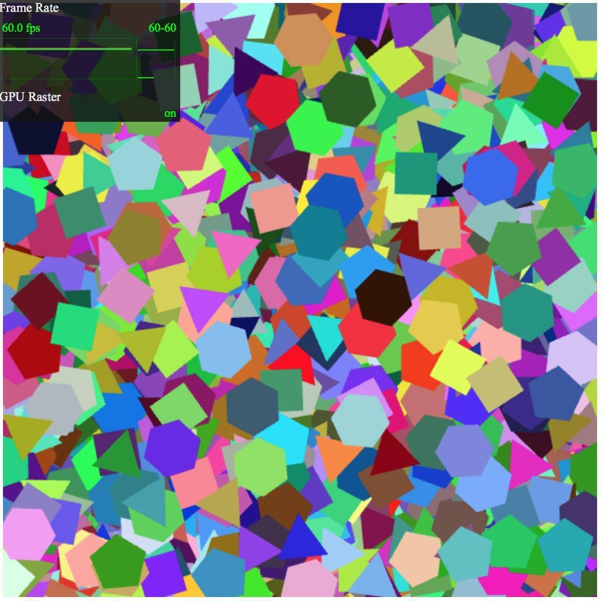 不过这个例子的性能就更差了,渲染完3000个图形之后只有大概5fps。当然这是正常的,因为正四边形、正五边形、正六边形每个分别要用2、3、4个三角形,所以虽然要绘制3000个图形,但我们实际绘制的三角形数量要远多于3000个。
