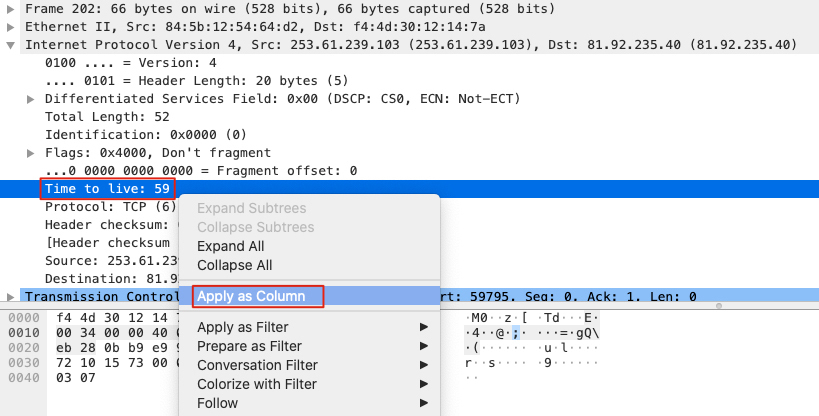 不过,这样看几个报文的TTL还行,再多点就十分困难了。怎么做才能更有效率呢?答案是借助Wireshark的自定义列。我们可以这样做: