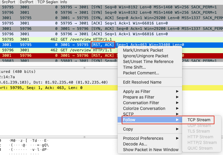 我们觉得某个RST包比较可疑,那么还是用Follow -> TCP Stream的方法,找到对应的TCP流: