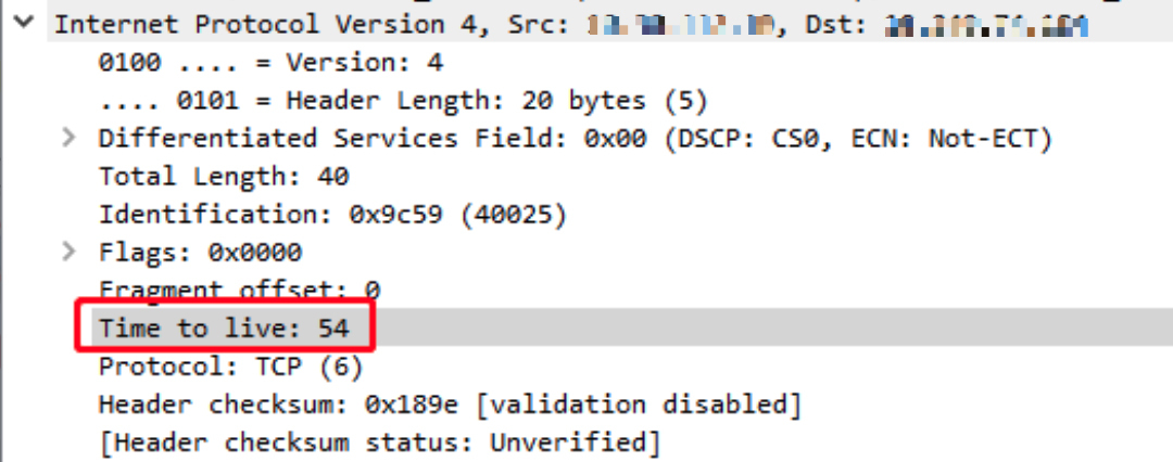 从服务端视角来看,它收到的报文只有三个:SYN包、ACK包、最后的RST包。我们选择SYN和RST,来对比看下它们的TTL是多少。下图是SYN包: