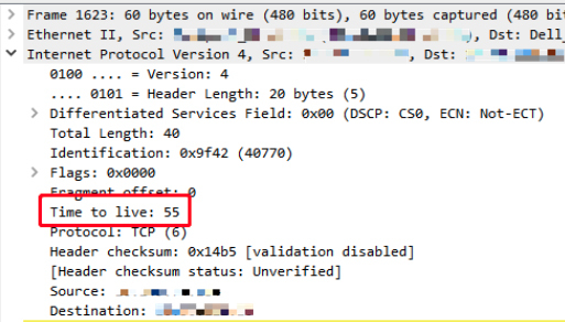 因为TTL是从出发后就开始递减的,那么必然,网络上我们能抓到的包,它的当前TTL一定比出发时的值要小。而且,我们可能也早就知道,TTL从初始值到当前值的差值,就是经过的三层设备的数量。