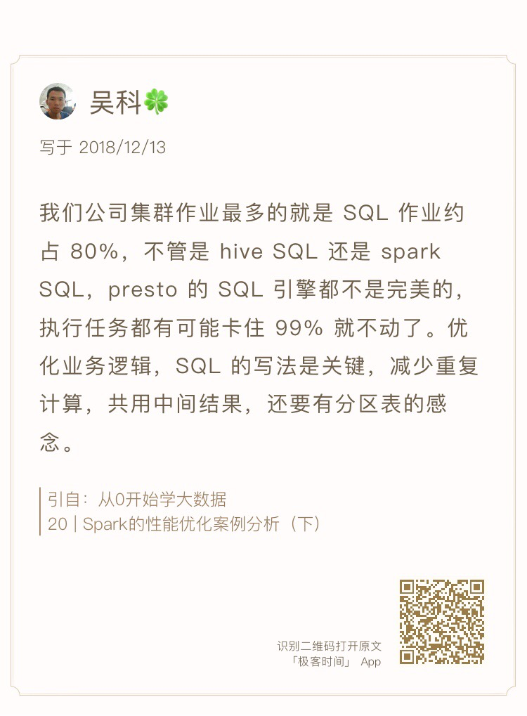 大数据实践的第三个层次是开发实践,大数据产品开发有两种,一种是重新开发,比如前面讲过的Doris、Dew,自己从头设计开发一个大数据系统,这样对学习的好处是可以更深刻、更全面理解大数据。另一种就是参与开源大数据产品的开发,比如前面讲过的Spark源码优化,这样的好处是可以和全世界最顶级的工程师一起讨论问题,通过交流学习提高。我在参与Spark开发的时候,跟Databricks、Cloudera的工程师交流,这些人可能是大数据技术领域最顶级的工程师,跟他们交流收获最深刻的不是技术,而是对他们技术水平的判断,以及进而对自己技术水平的判断,并因此促使自己思考自己未来的技术发展之路与人生之路。