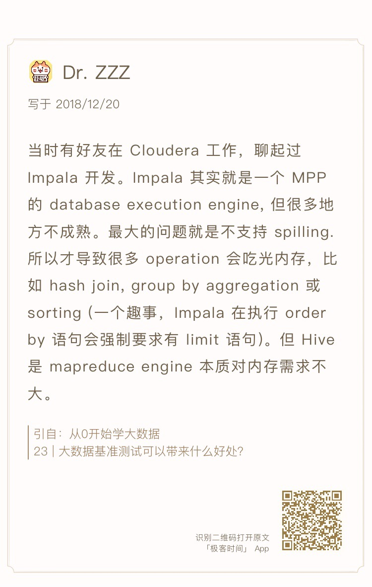 第一个层次是练习实践,我的专栏剖析架构原理居多,这是专栏定位决定的,而且学习大数据真正的难度,或者说决定你技术高度的依然是你是否理解了大数据技术的核心原理。但是大数据的学习一定要配合练习实践,不管是Hadoop、Spark、Hive的部署,还是编程练习实践,网上的教程都有很多,step by step入门学习的资料也很多。通过这些练习实践,结合专栏的原理分析,可以由表及里,从如何上手操作,到理解背后的原理机制,最后能够做到融会贯通。我看到专栏评论里很多同学贴了代码上来,一边学习一边实践,我们向这些同学学习。