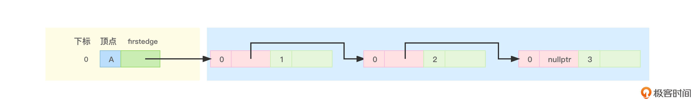 这样看起来,下标0所代表的顶点A相关的所有边(“0、1”,“0、2”,“0、3”)就链在一起了,把上面的图1拆开细分一下,与顶点A相关的部分如图2所示: