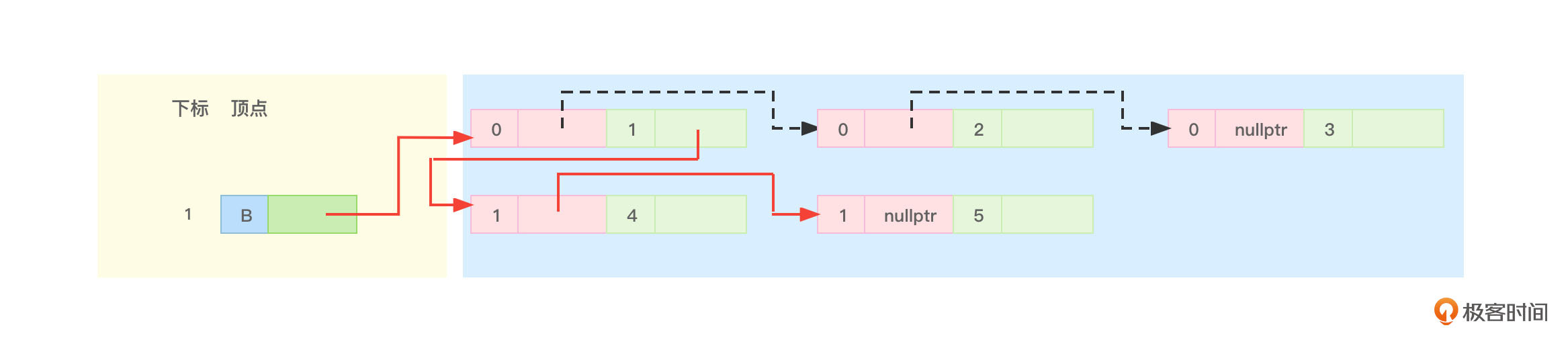 - “1、4”边节点的ilink指针就可以指向“1、5”边节点,顶点B没有其他相关边了,所以“1、5”边节点的ilink指针就应该指向nullptr。