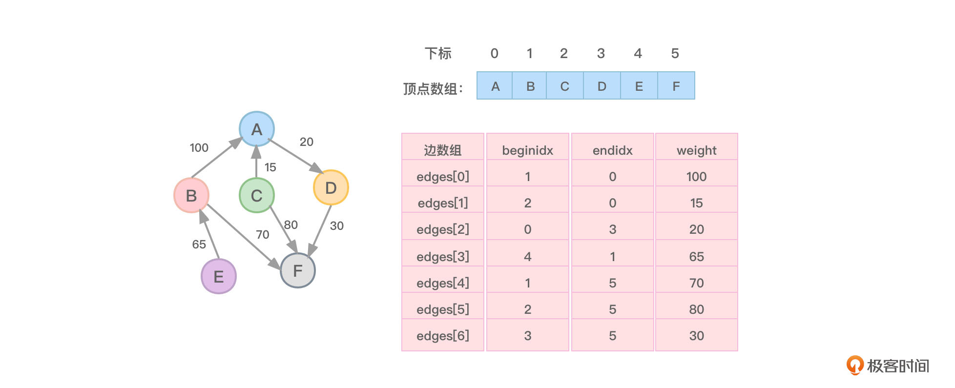 边集数组由两个一维数组构成,一个存储顶点信息,另一个存储边信息。边数组的每个元素是一个结构,结构成员包括边的起始顶点下标、边的终止顶点下标、权值。