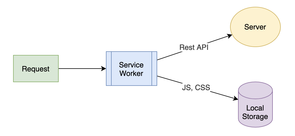 可以看到,Service Worker 会拦截所有浏览器发送出来的请求,你可以通过代码去控制 Rest API 这些请求发送到服务器;而 JS、CSS 等静态资源,则通过 Cache Storage 存储在浏览器端。
