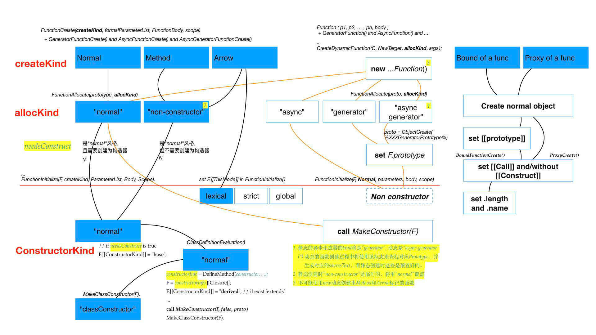 NOTE:在ECMAScript 6中,动态函数的创建过程主要由FunctionAllocate和FunctionInitialize两个阶段完成。而到了ECMAScript 9中,ECMAScript规范将FunctionAllocate的主要功能归入到OrdinaryFunctionCreate中(并由此规范了函数“作为对象”的创建过程),而原本由FunctionInitialize负责的初始化,则直接在动态创建过程中处理了。