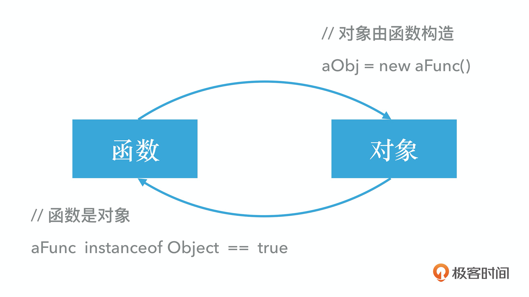 这种处理/设计使得JavaScript中的函数有了“完整的”面向对象特性,函数的“类化”实现了JavaScript在函数式语言和面向对象语言在概念上的大一统。于是,一个内核级别的概念完整性出现了,也就是所谓:对象创建自函数;函数是对象。如下图所示: