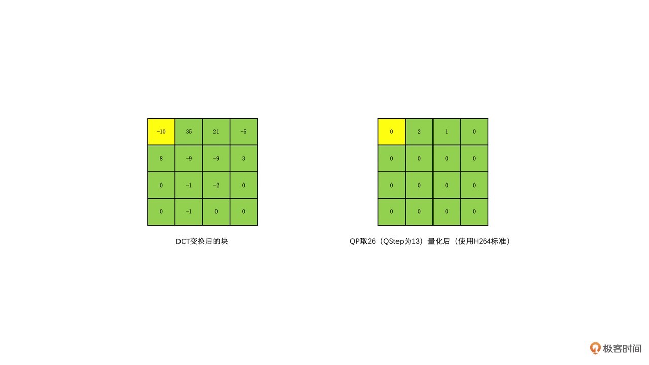 我们让变换块的系数都同时除以一个值,这个值我们称之为量化步长,也就是QStep(QStep是编码器内部的概念,用户一般使用量化参数 QP这个值,QP和QStep一一对应,你可以自行去网上查询一下转换表),得到的结果就是量化后的系数。QStep越大,得到量化后的系数就会越小。同时,相同的QStep值,高频系数值相比低频系数值更小,量化后就更容易变成0。这样一来,我们就可以将大部分高频系数变成0。如下图所示: