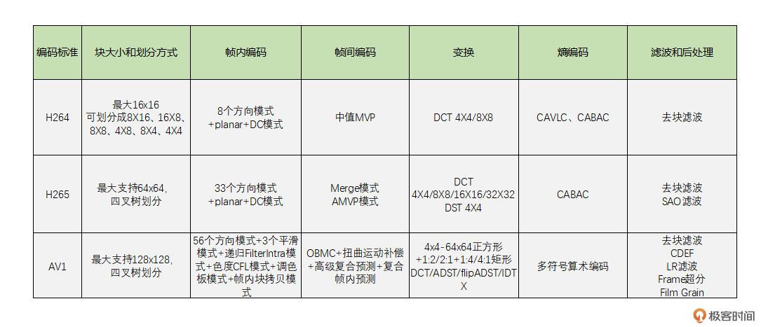 目前普通产品还是使用H264最多,而H265因为专利费使用得比较少。VP8是WebRTC默认的编码标准,且WebRTC使用VP8最多。同时,WebRTC也支持VP9和AV1。YouTube使用了VP9和AV1。Netflix也使用了AV1。我们下面来比较一下H264、H265、AV1这三代编码算法的区别。现在你不理解没有关系,等你学完后面的课程会很容易明白下面表格中所涉及的知识的。