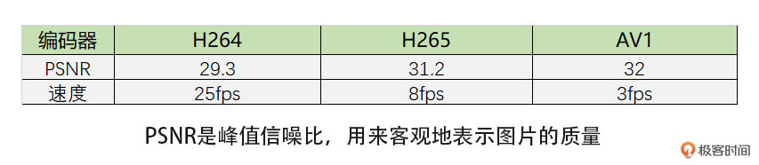 我做了个简单的编码清晰度和耗时对比,都是在软件编码下进行的。具体如下表所示。我们可以看到相同码率下,AV1清晰度稍好于H265,而H264最差,但是编码耗时则相反,AV1最高,H265次之,H264速度最快。