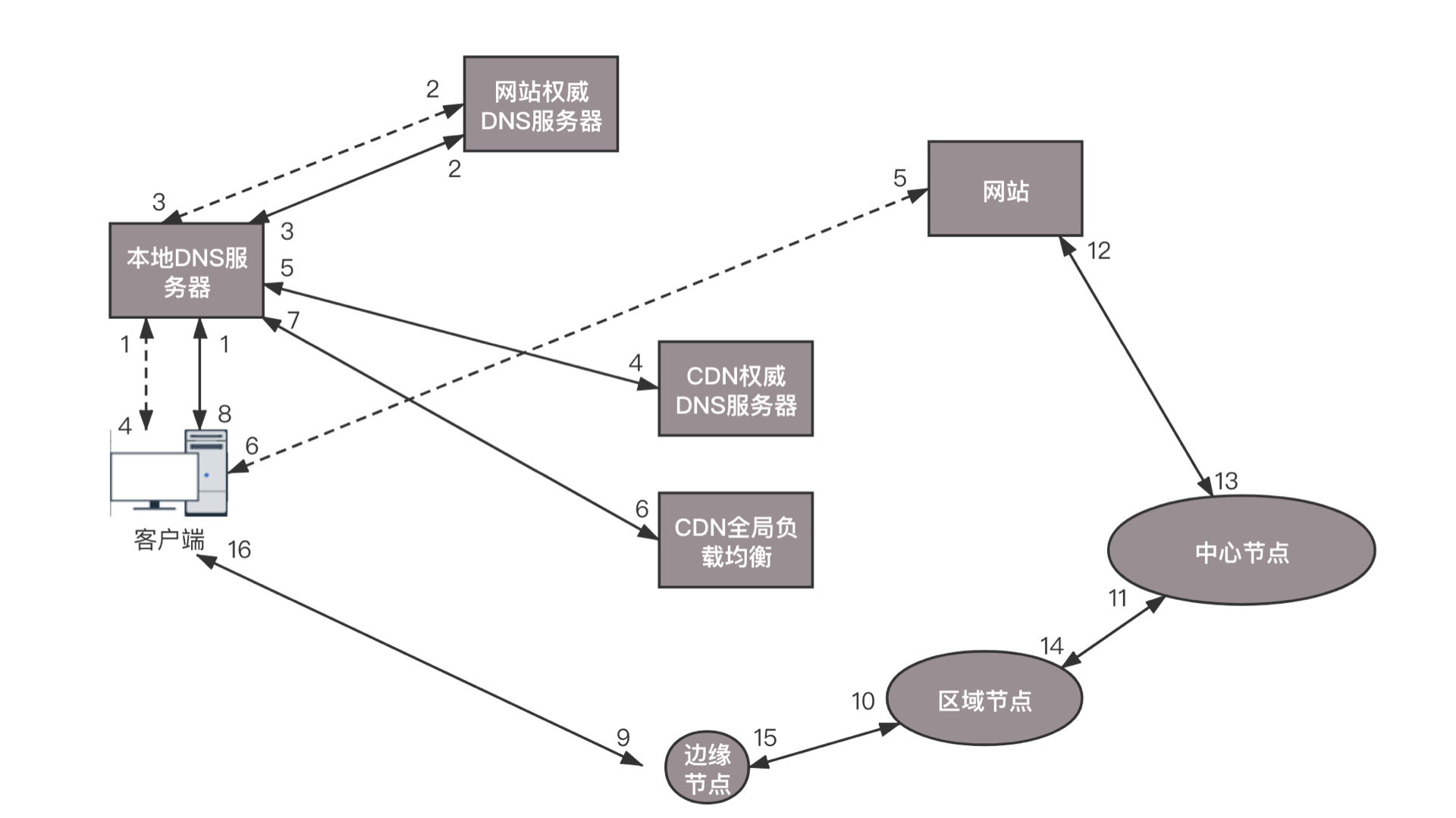 在没有CDN的情况下,用户向浏览器输入www.web.com这个域名,客户端访问本地DNS服务器的时候,如果本地DNS服务器有缓存,则返回网站的地址;如果没有,递归查询到网站的权威DNS服务器,这个权威DNS服务器是负责web.com的,它会返回网站的IP地址。本地DNS服务器缓存下IP地址,将IP地址返回,然后客户端直接访问这个IP地址,就访问到了这个网站。