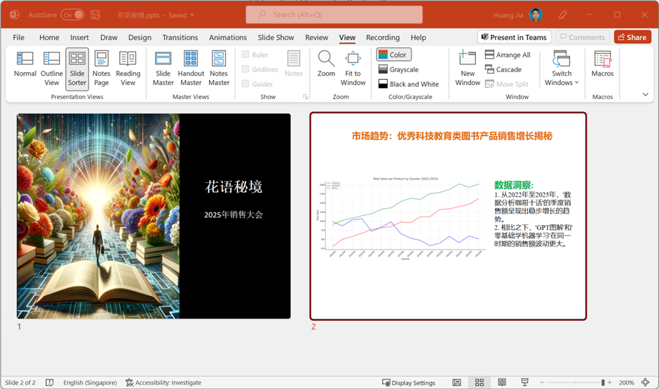 我们当然也可以传入文件给大模型,让它完成实质性的数据分析工作。强大的OpenAI Asistants助手,甚至能够从我的一个数据文档出发,经过正确的自然语言提示引导后,一键创建出下面这种质量的PPT。