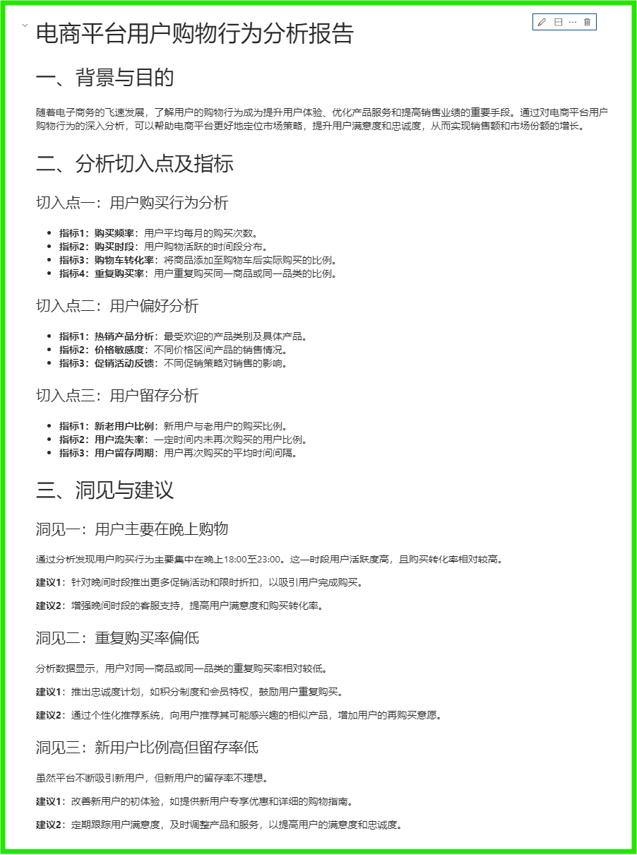 上述提示,直接引导GPT生成了一份高质量数据报告。这还是在只有提示词,没有数据,凭空想象的前提下。