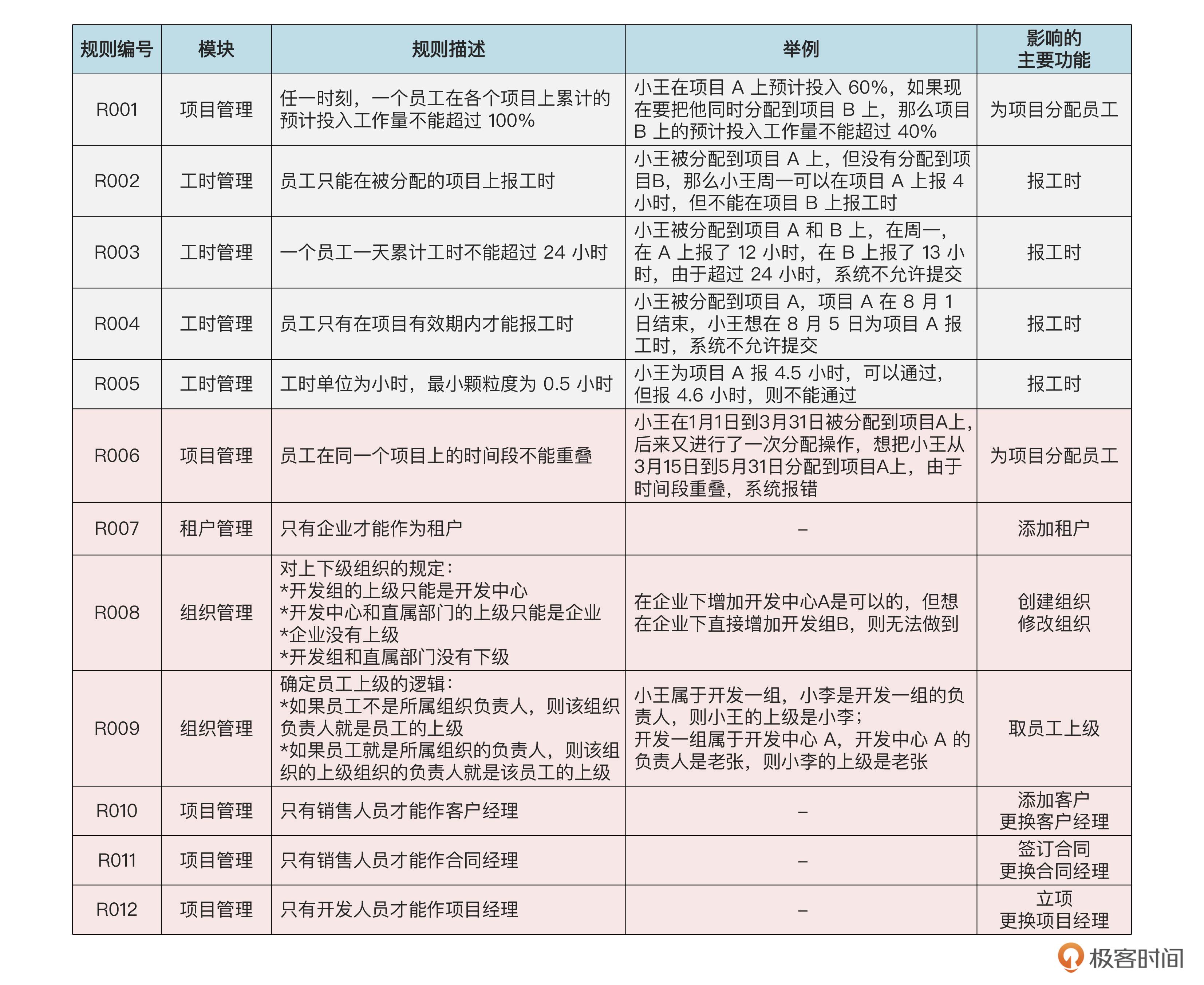 考虑到时间因素,有关投入百分比的业务规则可以进一步明确为“在任何时刻,一个人的预计投入百分比总和不能大于百分之百。”此外,从逻辑上,还可以识别一条规则一个员工在同一个项目上的时间段不能重叠。