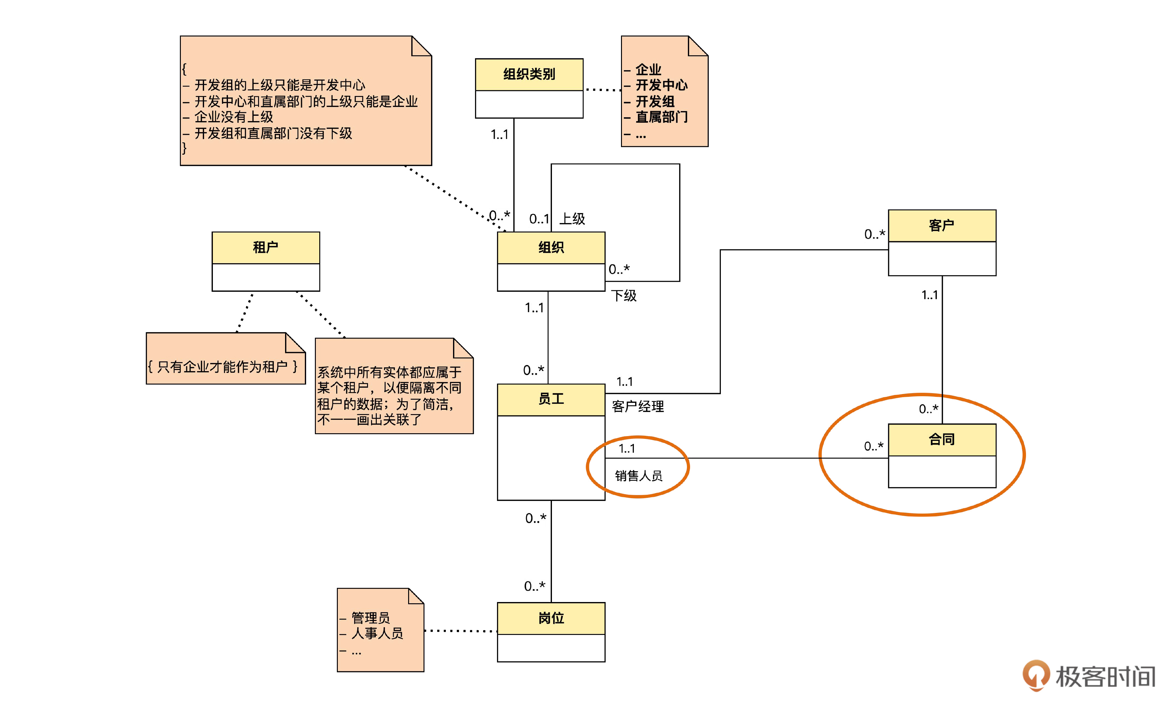 完成了对客户的建模,我们开始处理合同实体。根据需求,“每个合同都有一个销售人员负责”,于是,你画出了下面的模型图: