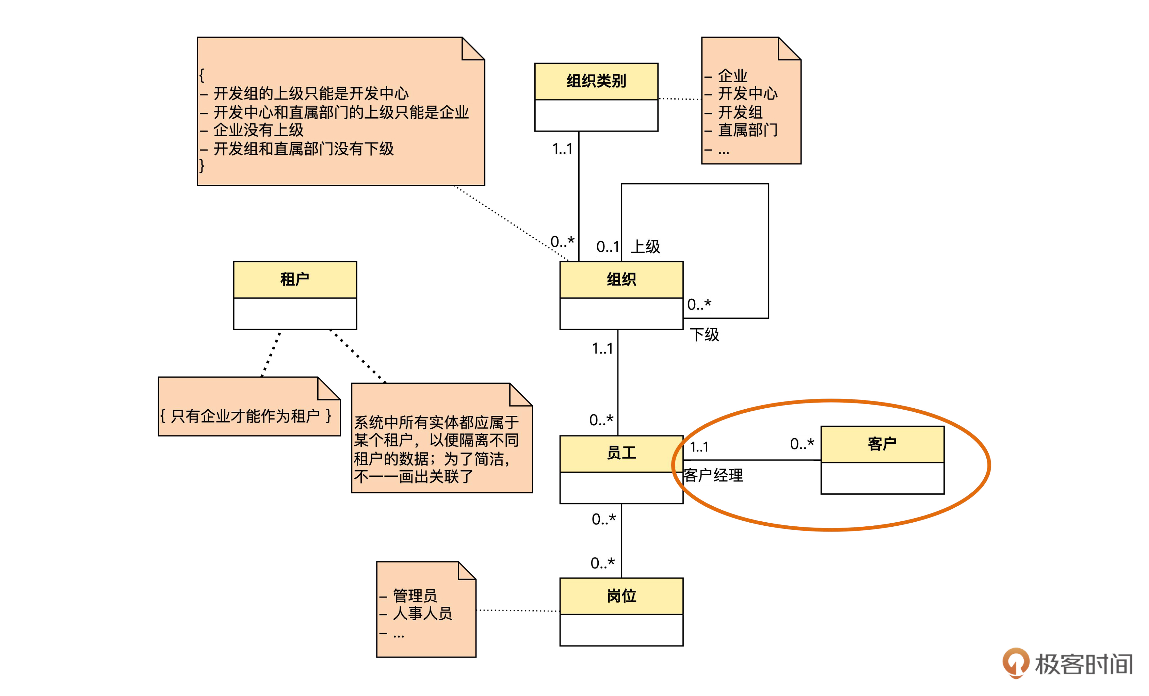 经过上面的梳理,我们已经把剩余的模型梳理得差不多了。但是,在事件风暴中咱们还遗留了一个问题:怎么处理客户经理上级、销售人员上级和项目经理上级这几个概念?现在看来,它们不太像是独立的实体,而更像是某种关系。