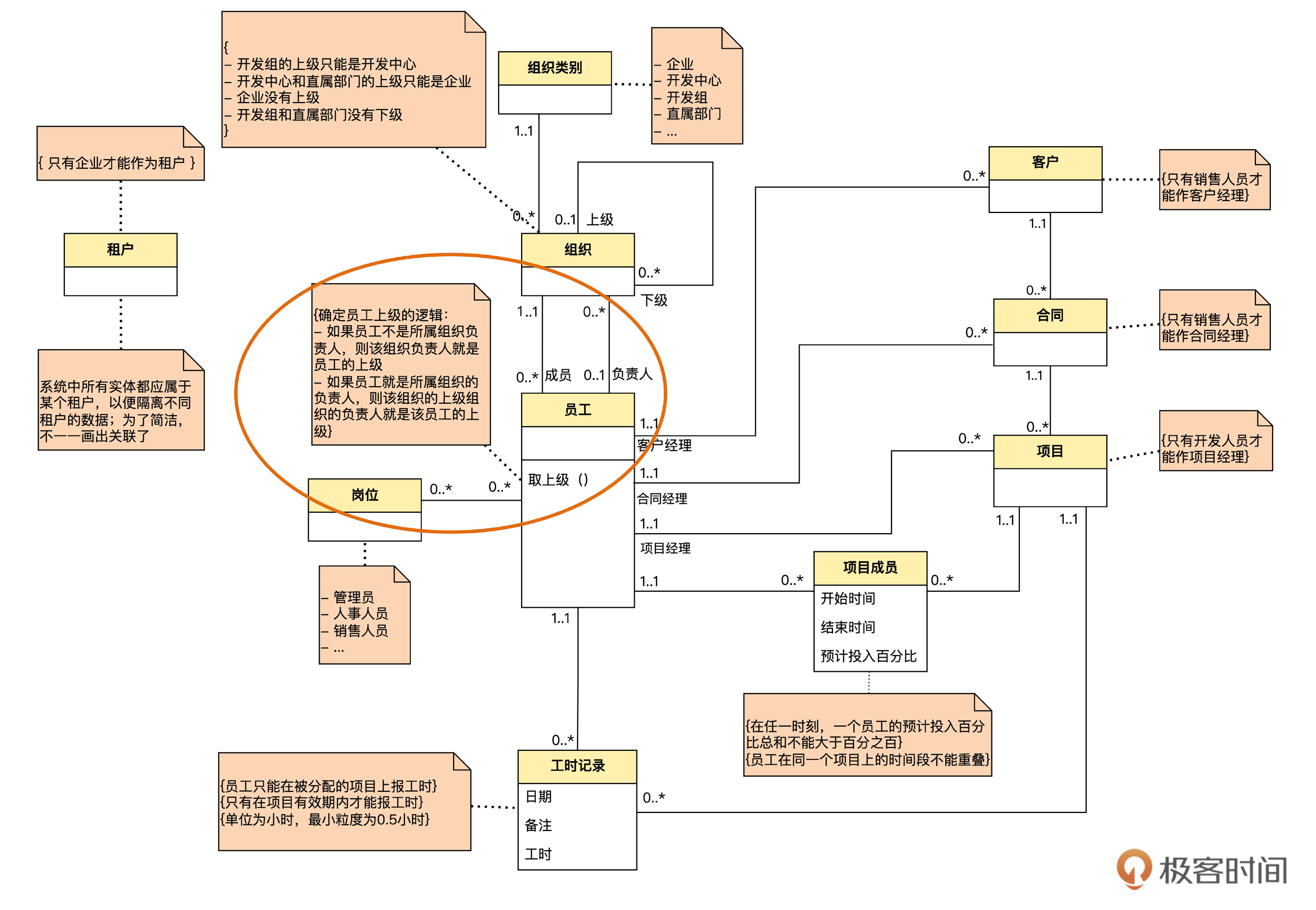 [上节课]咱们介绍了领域建模的一些概念,也一起完成了有关租户、组织和员工的领域建模。今天这一讲,我们继续对项目管理、人员分配和工时登记部分进行建模。
