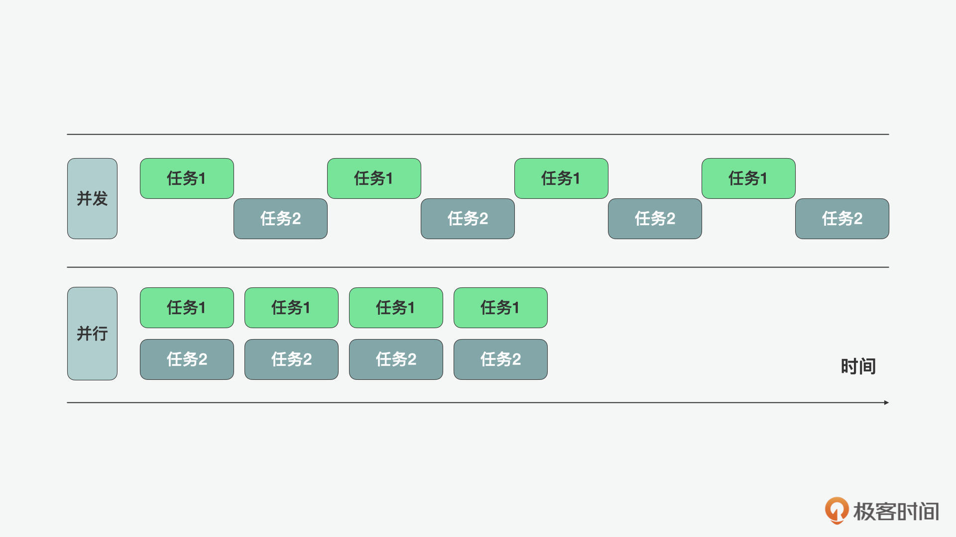 并发是同一时间段进行的任务,而并行是两个在同一时刻进行的任务。除非是多核CPU,否则如果只有一个CPU的话,多线程本身并不支持并行,而只能通过线程间的切换执行来做到并发。从下图中,你可以对并发和并行有更直观的认识。