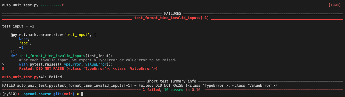 #We use the @pytest.mark.parametrize decorator again to test the invalid inputs. @pytest.mark.parametrize('test_input', [ None, 'abc', -1 ]) deftest_format_time_invalid_inputs(test_input): #For each invalid input, we expect a TypeError or ValueError to be raised. with pytest.raises((TypeError, ValueError)): format_time(test_input)