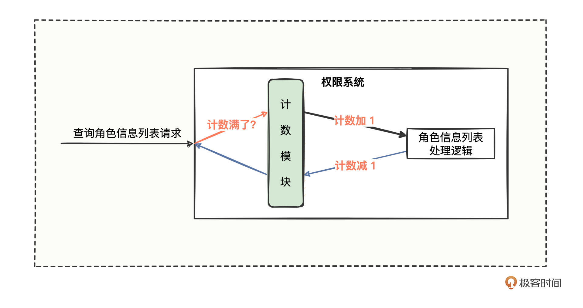 查询请求进入权限系统后,正常情况是先经过计数模块,计数模块进行加1操作,再去处理业务逻辑,待业务逻辑处理完成后返回时,再进行计数减1操作。如果请求进来时,计数模块发现实时容量已满,就拒绝或者等待一会。