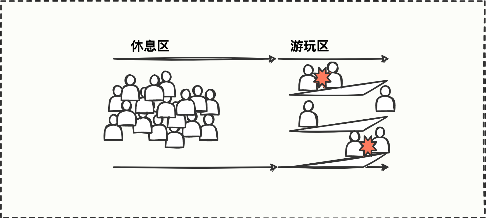 没错,可以在休息区和游玩区之间增加一个等候区,等游玩区的小朋友下滑梯了,等候区的小朋友接续上去玩,保证游玩区每个小朋友都能有单独玩滑梯的机会,这样一来,游玩区的秩序也维护了,小朋友被撞伤的风险也极大降低了。