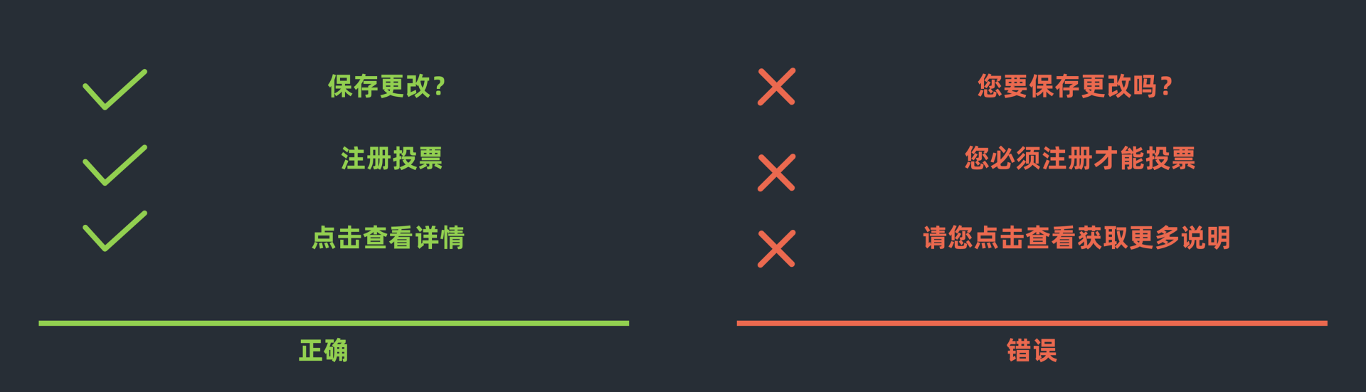 在日常生活中,你永远总是和身边的人用类似上面左半部分的表述来沟通,但是在当今应用界面上,右半部分的表达却比比皆是。这种习惯一定要改掉。