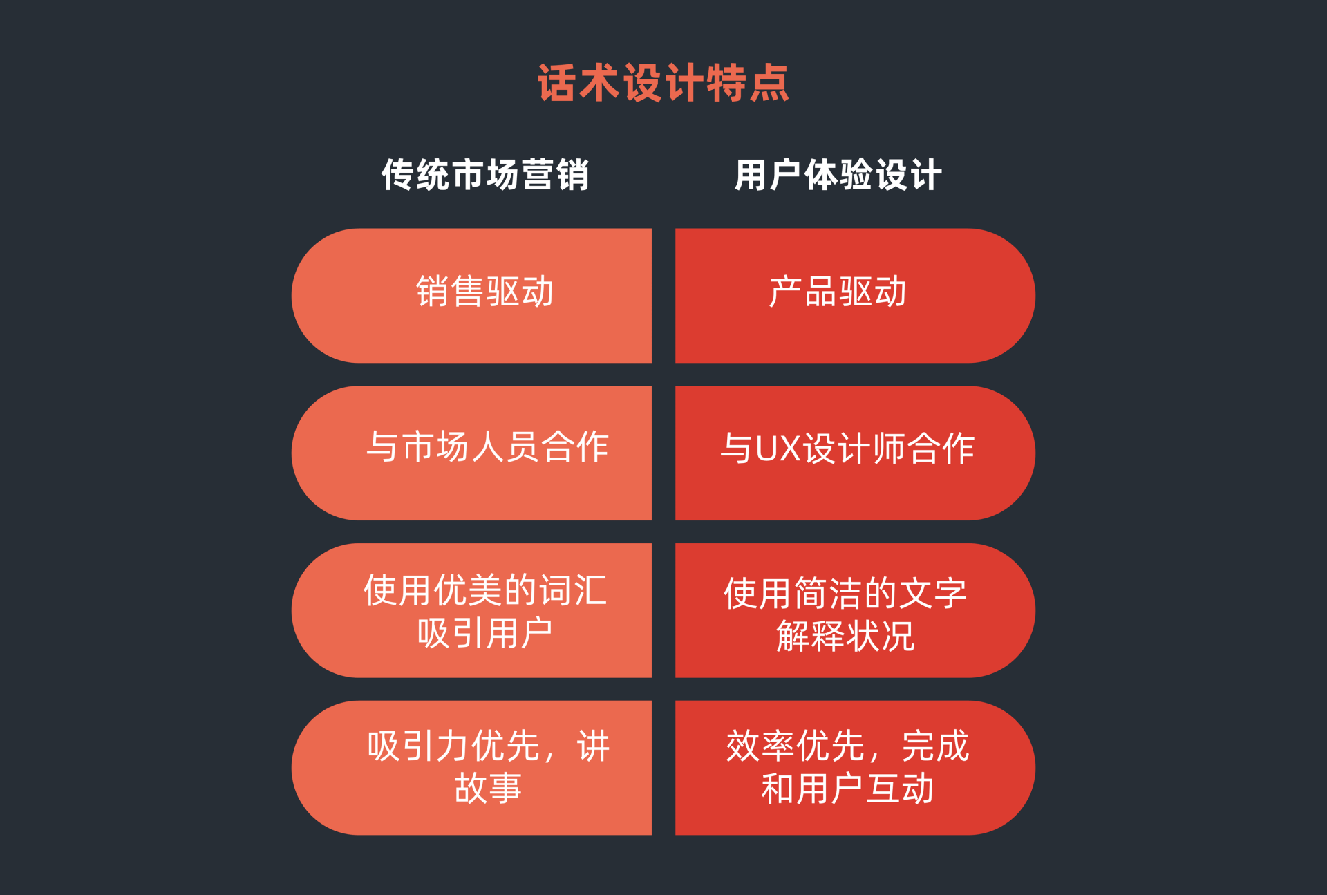 我们先拿用户体验设计中的话术设计和传统市场营销中的话术设计来对比一下: