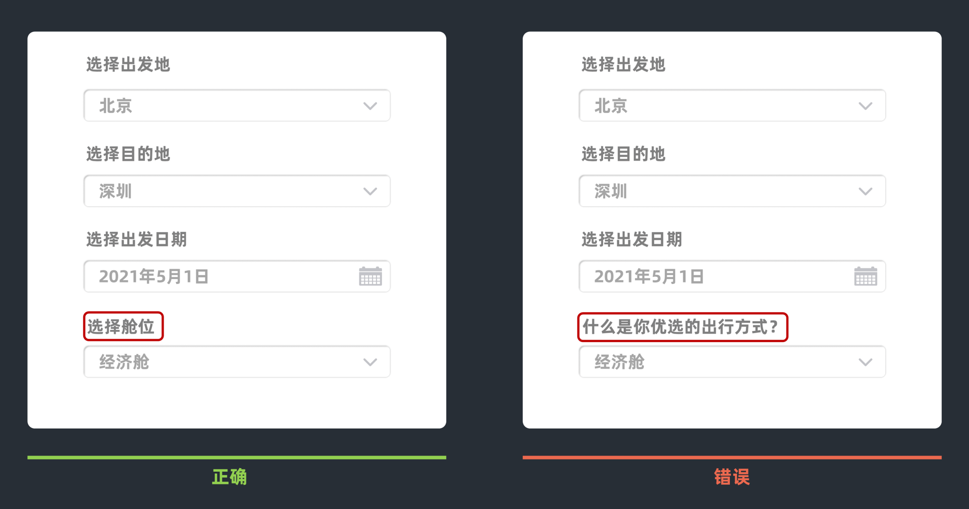 在下图中左半部分是正确的做法,右半部分则是增加用户认知负荷的错误示例。