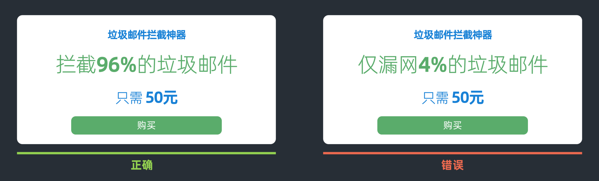 在[13]里我们提过框架效应的认知偏见。对于同样一个意思来说,一个是正面框架描述,一个是负面框架描述,大部分用户都会喜欢前者。