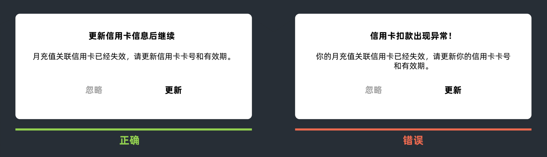 比如下图里用户的信用卡换卡了,导致以前自动进行信用卡扣款的应用无法正常扣款,我们需要提醒用户尽快更新有效的用户信息。这时左边的表述会让用户第一时间知道当前出现了什么状况,而右边则让用户心头一紧。