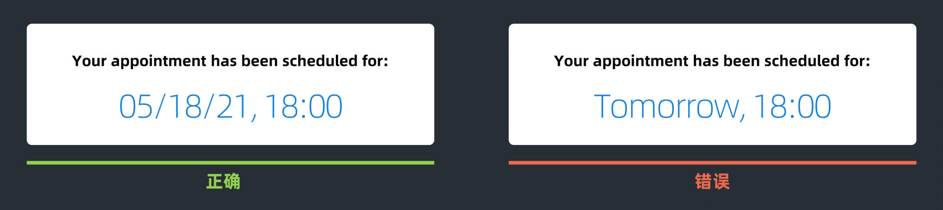在显示日期的时候,如果可能,请使用“昨天”、“今天”和“明天”来替代日期,以避免用户出现因为错误理解当天是几号而判断失误的情况。