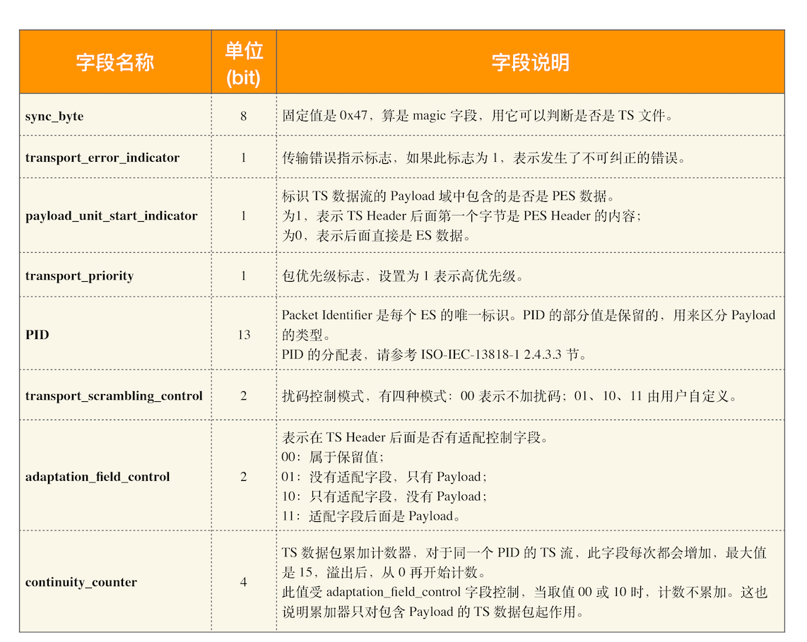 这是 TS Header 各个字段的详细说明,图中数字表示长度,如果数字后面带有 bytes ,单位就是 bytes;否则,单位都是 bit。