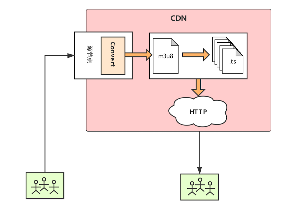 如上图所示,客户端采集媒体数据后,通过 RTMP 协议将音视频流推送给 CDN网络的源节点(接入节点)。源节点收到音视频流后,再通过 Convert 服务器将 RTMP 流切割为 HLS 切片文件,即 .ts 文件。同时生成与之对应的 m3u8 文件,即HLS播放列表文件。