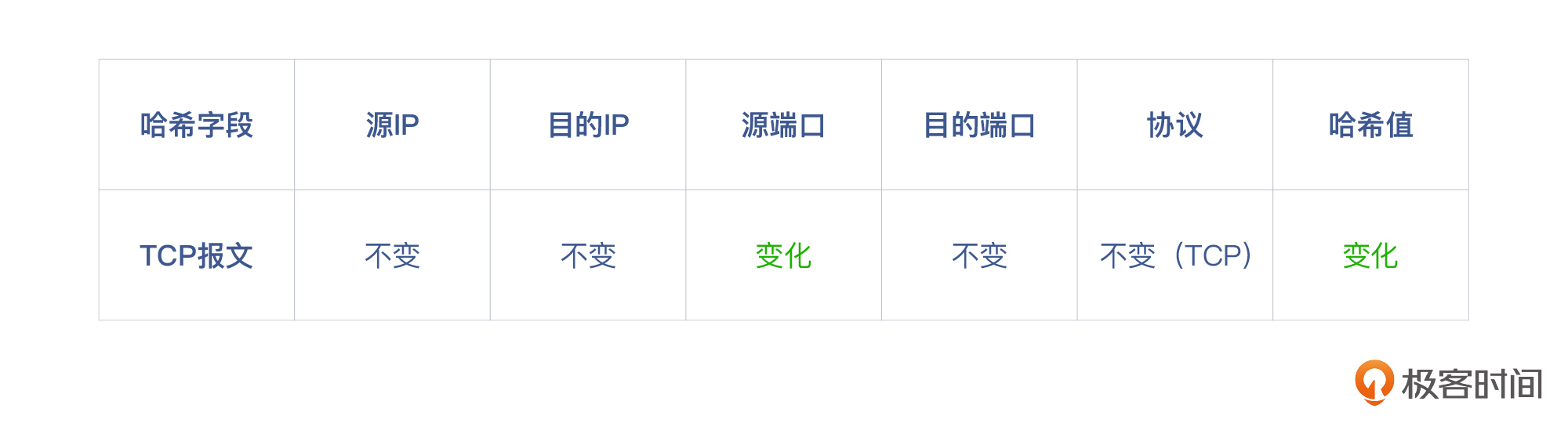 所以我们需要“立规矩”,让同一个流走固定的链路,这样可以限定影响的范围。比如,启用基于哈希的转发机制(也就是三层的负载均衡机制)就可以做到这一点。比较常见的哈希算法是基于报文的五元组,也就是源IP、目的IP、源端口、目的端口、协议,这样就可以确定TCP流。