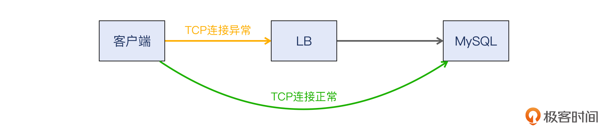 在前面很多次课里,我都提到过用“排除法”或者说是“逐段验证法”来开展排查。这次也不例外,我们就从客户端直接去连接MySQL主机,重试了很多次,TCP连接都可以正常建立。于是,MySQL主机的嫌疑基本可以排除,我们又集中到对LB的排查上来。