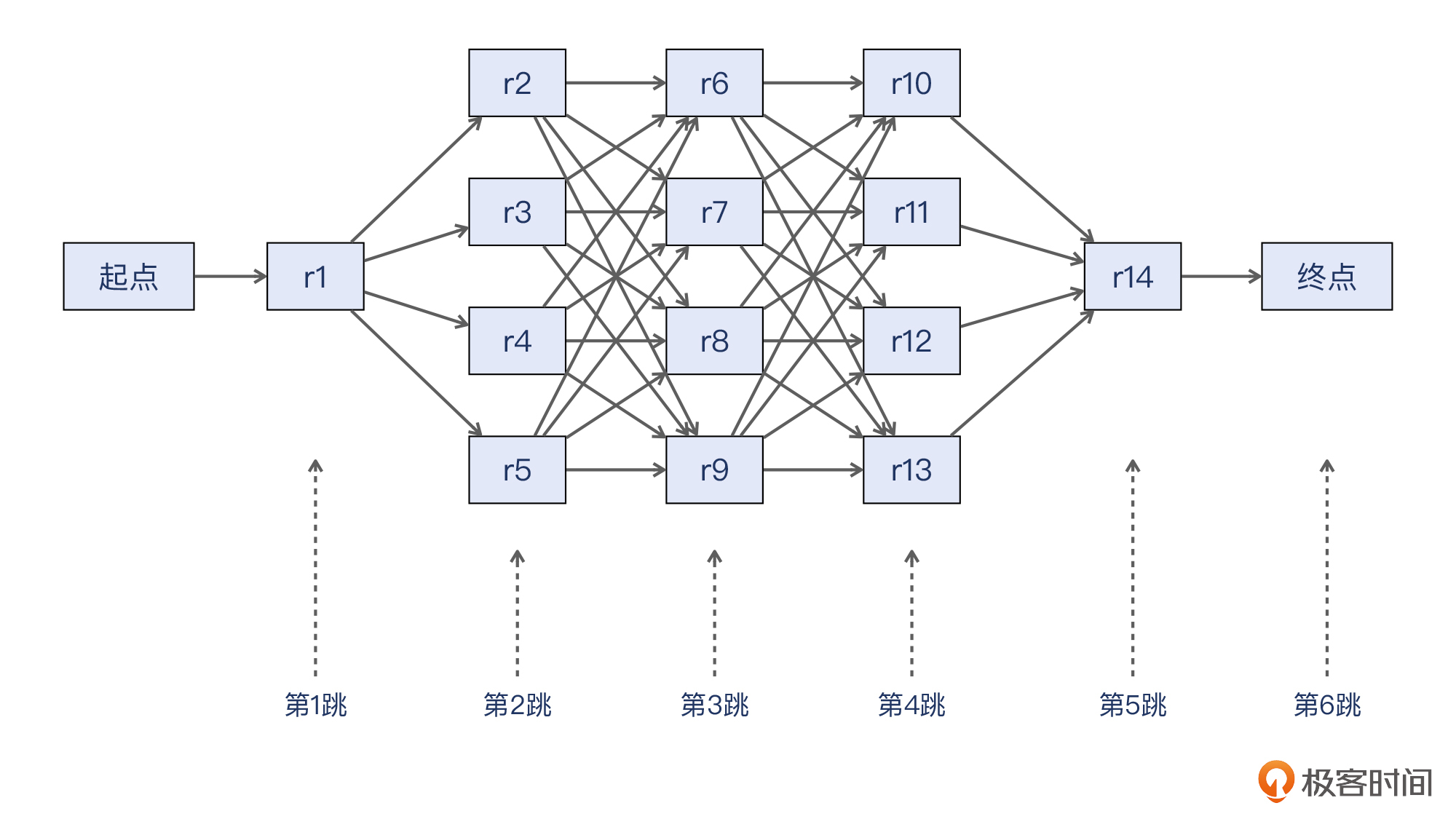 比如,原先每一跳只有一个可用的next-hop,从起点到终点的路径可能只有一条。而启用了ECMP后,路径条数就是各跳的next-hop数量的乘积。以下图的拓扑为例,这里一共是6跳,从第1跳到第4跳都各有4个next hop,那么就有 1*4*4*4*1*1=64 种可能的路径。