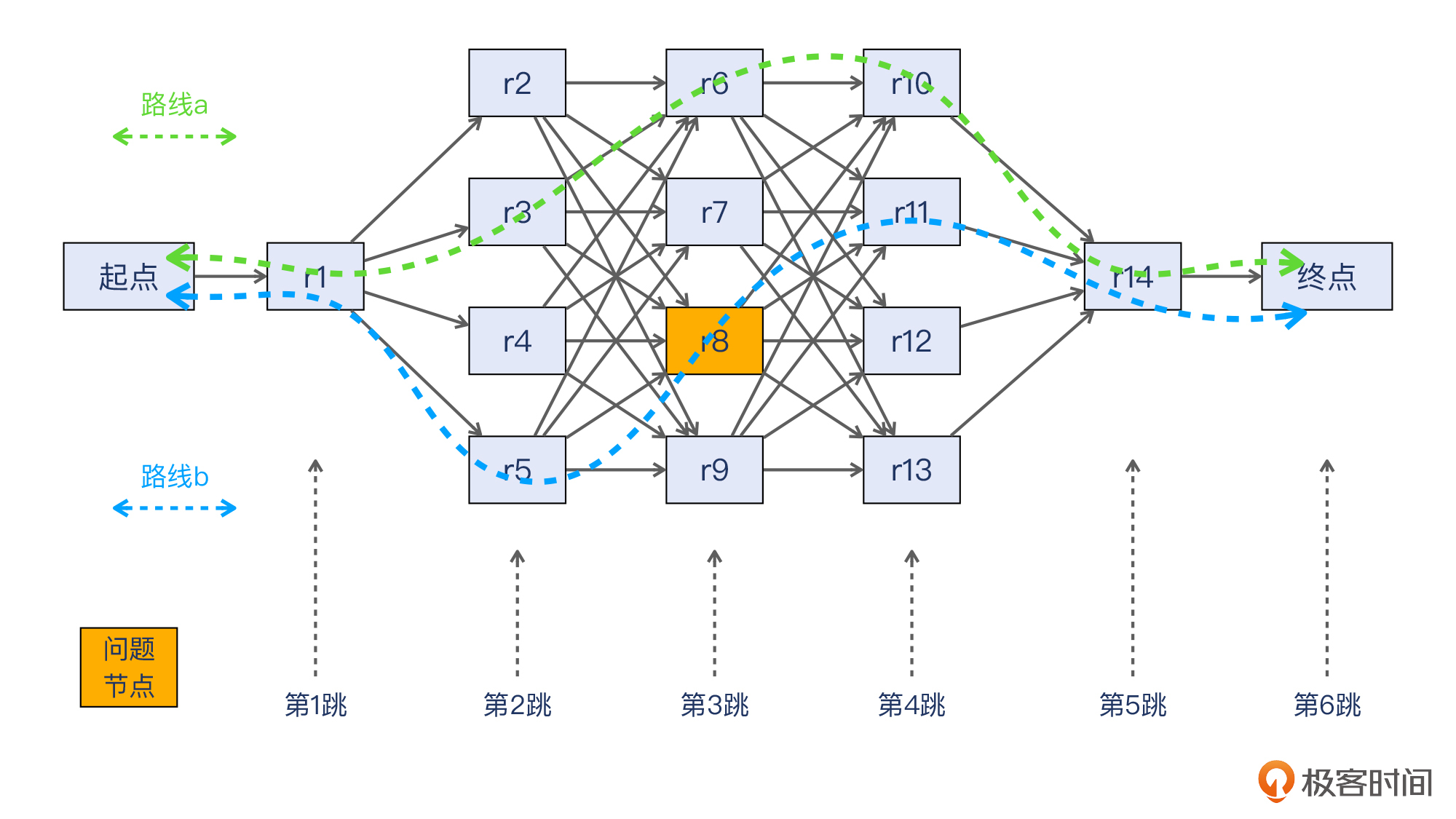 补充:图中我去掉了各个路由节点,只保留了一条正常路径和一条故障路径。