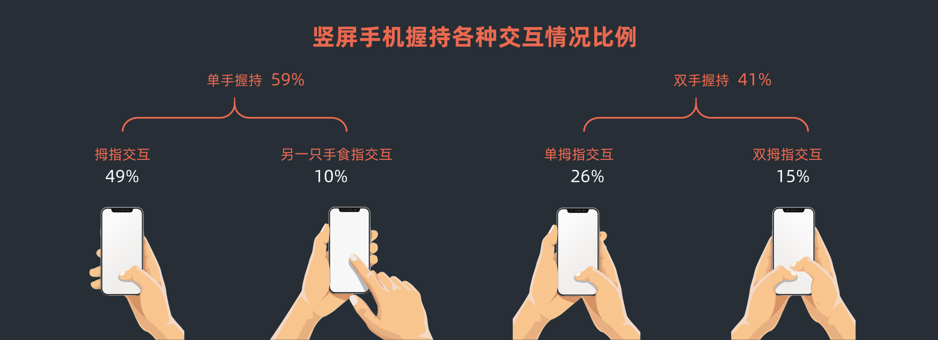 - 单手握持占59%,其中靠拇指交互的占49%,靠另一只手食指交互的占10%;