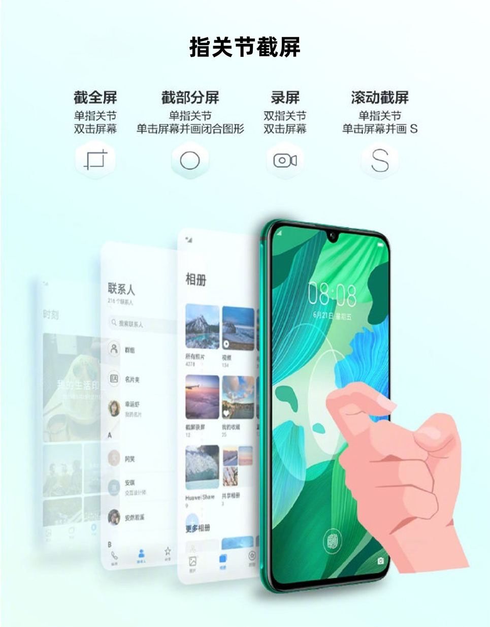 在华为的移动设备里有一个非常独特的触屏交互,那就是指关节截屏交互。具体交互方式如下图所示。为什么华为引入指关节作为截屏操作呢?