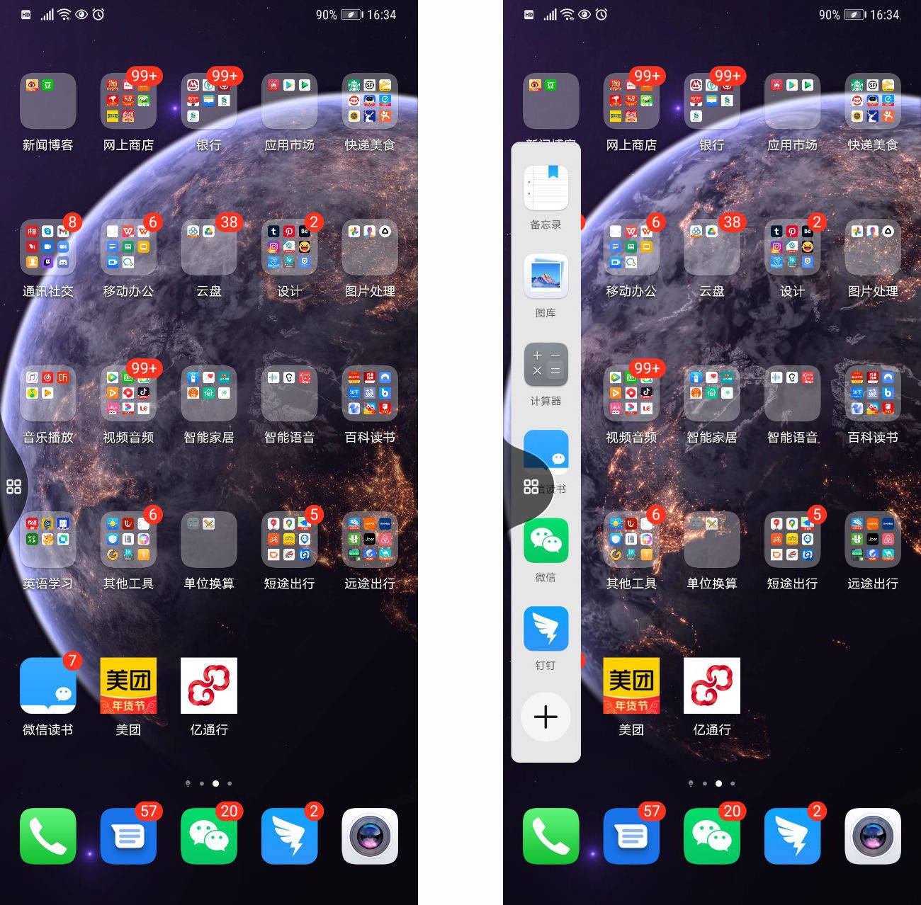 华为的侧边导航返回和侧边栏交互很好地考虑到了减少腕掌关节的运动,以避免腱鞘炎的发生。