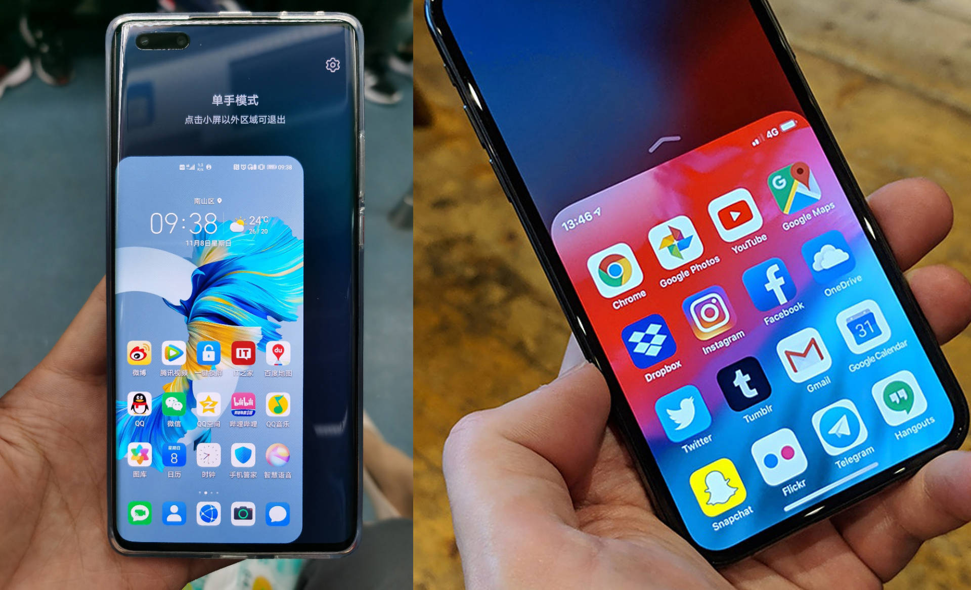 提到单手握持,那么必然要提到单手模式。手机厂家考虑到很多人依然有单手操作屏幕上方的需求,于是有了单手模式的诞生。不同厂家有不同的处理方式,下图左边是华为的单手模式,右边是苹果的单手模式,你可以对比一下(华为单手模式的调出方式是底边缘横滑调出,苹果是底部导航条向下滑动调出)。