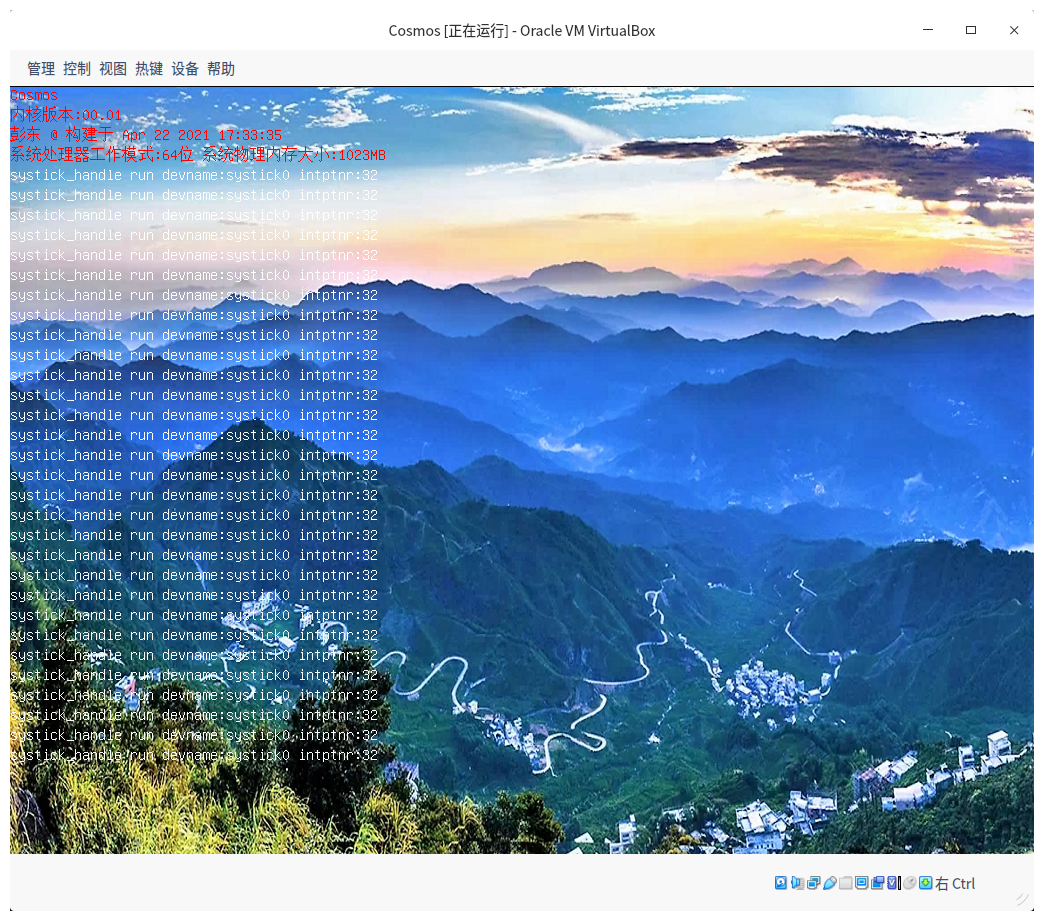 下面,我们把内核层初始化函数恢复到原样,重新打开终端切到cosmos目录下,执行make vboxtest指令,我们就将会看到如下界面。